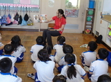 よむレンジャーサポーターの方々が読み聞かせに来てくださいました。本の題名の一部を紹介します。「はらぺこあおむし」「あめがふるひに・・・」「パパのかえりがおそいわけ」「光の旅かげの旅」とこれは一部ですがたくさんの種類の本の読み聞かせを行ってくれています。子供たちも毎回どんな本か楽しみにしています。