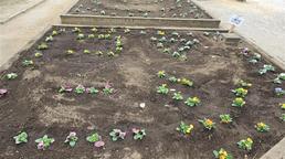 花ボランティアの方と児童が協働して人権の花を花壇に植えました。「コマ二シ」という花文字もあります。
