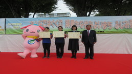 本校は、昨年度から夏に向けて職員室前にゴーヤを植えていました。ふじみ野市の「緑のカーテンコンテスト」に応募し、なんと「優秀賞」をいただきました。上福岡中央公園で開催されていた「緑の環境フェア」の中で、表彰式があり、高畑市長さんから、賞状をいただきました。今年は暑すぎたので、昨年よりこんもりした感じではなかったのですが、市内学校の中では本校のみでした。校務員さん、地域の方もお世話をしてくださった賜物です。ありがとうございました。